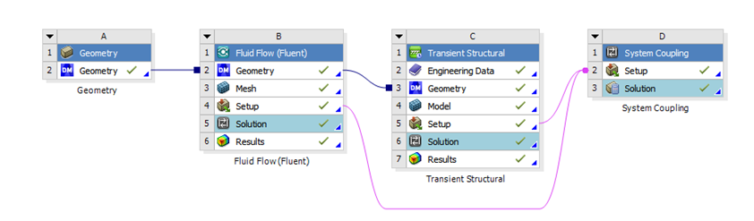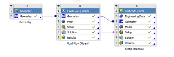 A one-way FSI simulation is a type of simulation in which the fluid models its effect on the structure, but does not act back to the fluid by the structure. This is achieved through a simple drag and drop task that automatically connects the geometry and solution cells of your simulation.